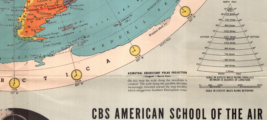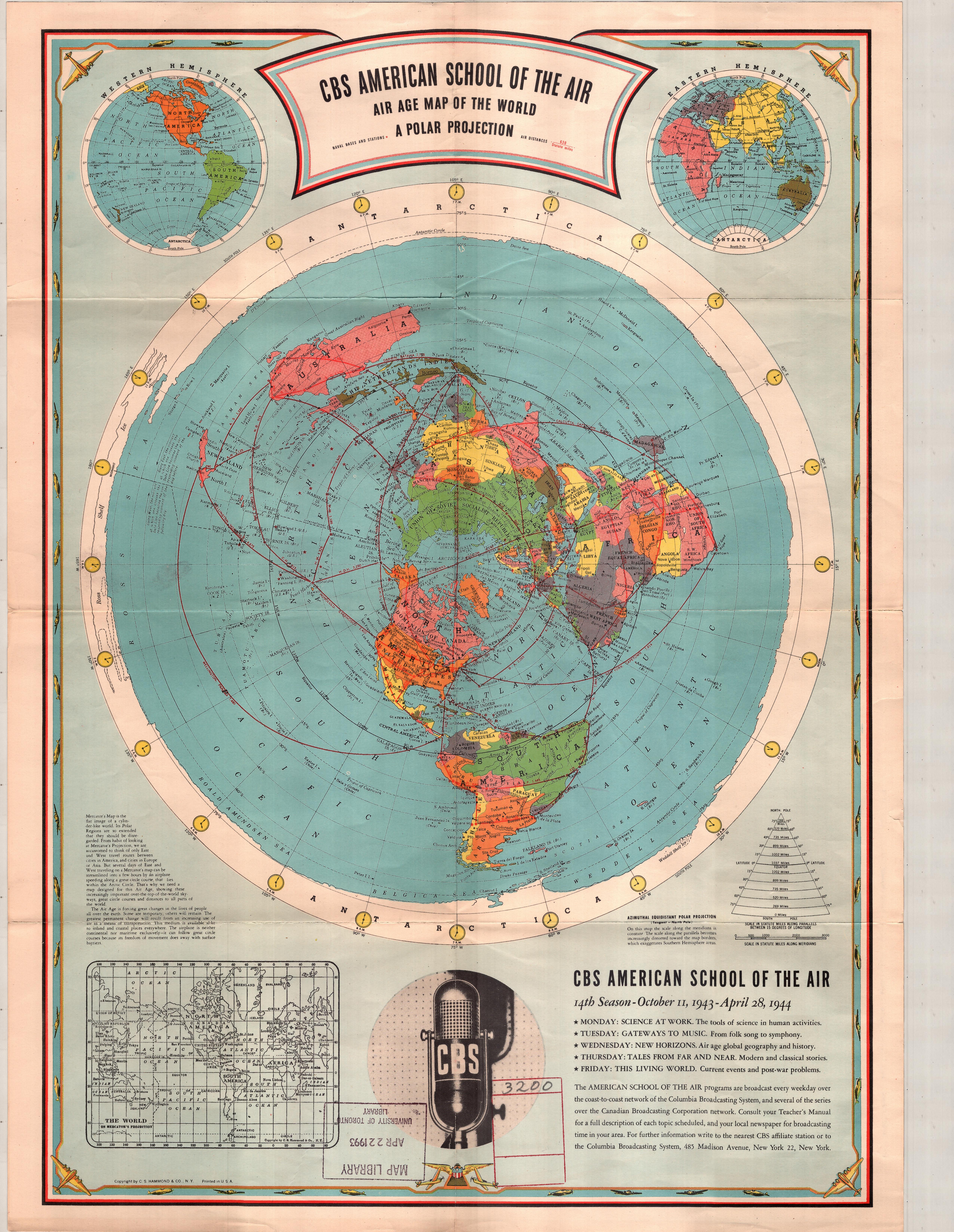 Er behauptet, dass CBS mit ihrer "AIR AGE MAP OF THE WORLD" bereits 1944 "mit der Flachen-Erde-Gleason-Karte für ihre wissenschaftlichen Sendungen" warb. Leider lässt er die Erklärungen auf der Karte selbst völlig ausser Acht. Diese zeigen nämlich eben genau die Tatsache auf, dass die Erde nicht flach ist, sondern dies eine "Polar Projektion" der "Zylindrischen Mercator Projektion" ist. Auf der Karte, rechts unterhalb der flach dargestellten Erde steht: