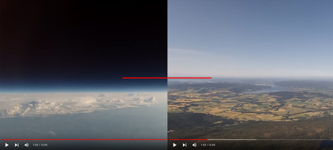 Man kann also auch eine Kugelerde oder sogar sowas wie eine Salatschüsselerde implizieren (Horizont weit unten ergibt konkave Form), wenn man das richtige Bild aus dem Video herausholt.
